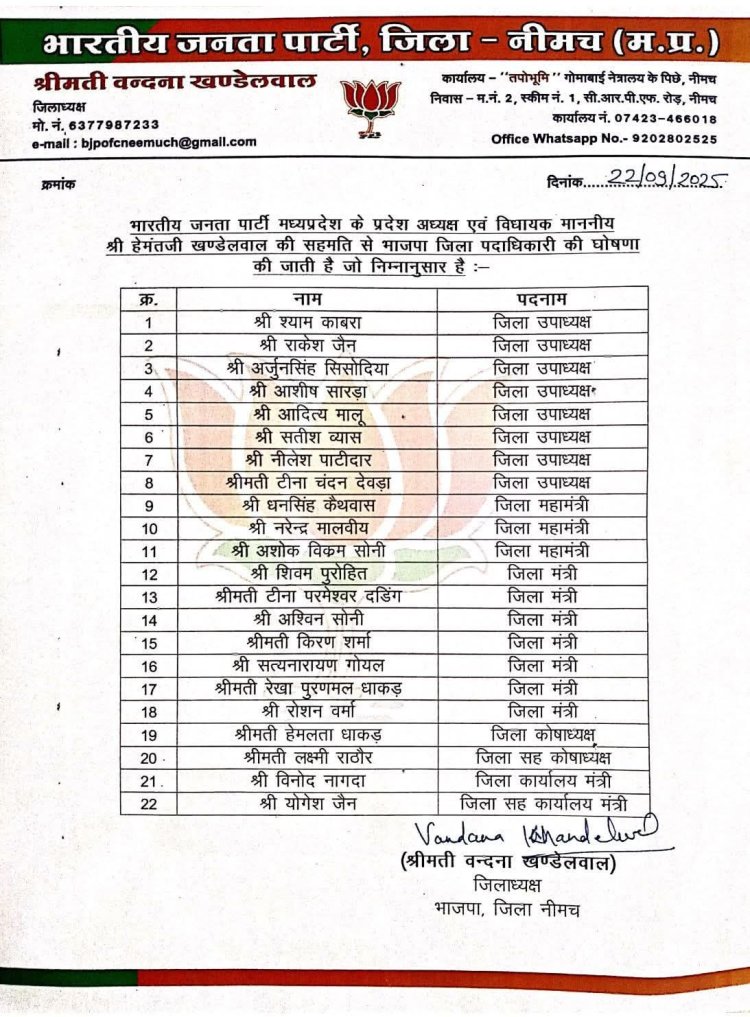 BIG NEWS : नीमच जिला भाजपा ने की पदाधिकारियों की घोषणा, इन्हें मिली बड़ी जिम्मेदारी, नामों की सूची भी आई सामने, पढ़े खबर