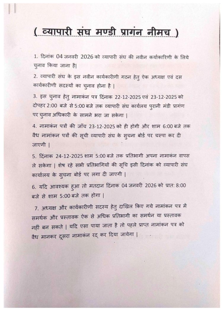 नीमच / व्यापारी संघ के चुनाव सालो बाद अब होने जा रहे है आने वाली 4 जनवरी को चुनाव की घोषणा पहले ही हो चुकी थी वही आज पूरा शेड्यूल भी चुनाव अधिकारी द्वारा जारी कर दिया गया है,